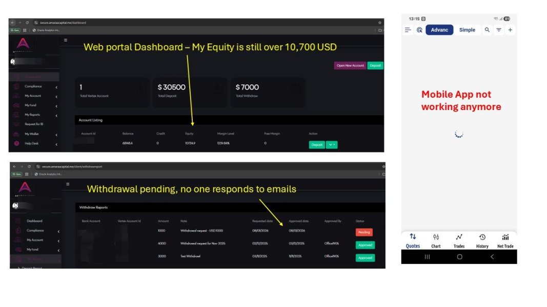 Hi, I opened my account in Oct 2025. Total deposit made over time is USD 30,500. I could withdraw USD 7000. I still have open positions in XAUUSD and total equity as of now is USD 10,700. However their Vertex app for trading does not work any more. My last withdrawal request for USD 1000 is not actioned for more than 3 weeks. No one responds to emails now. The salesrep says she relocated back to India and is no longer working in the company. The Relationship Manager says the company is closed, and no one responds to him also. Throughout the period, they continuously pressurized to make more deposits, take more risky trades, and big positions. Twice there was margin calls which they got reinstated when the price came back in my favour and after I deposited more money. I have all the evidences - emails, whatsapp, deposits, bank statements, that I can share. Any help in getting the money back would be greatly appreciated.