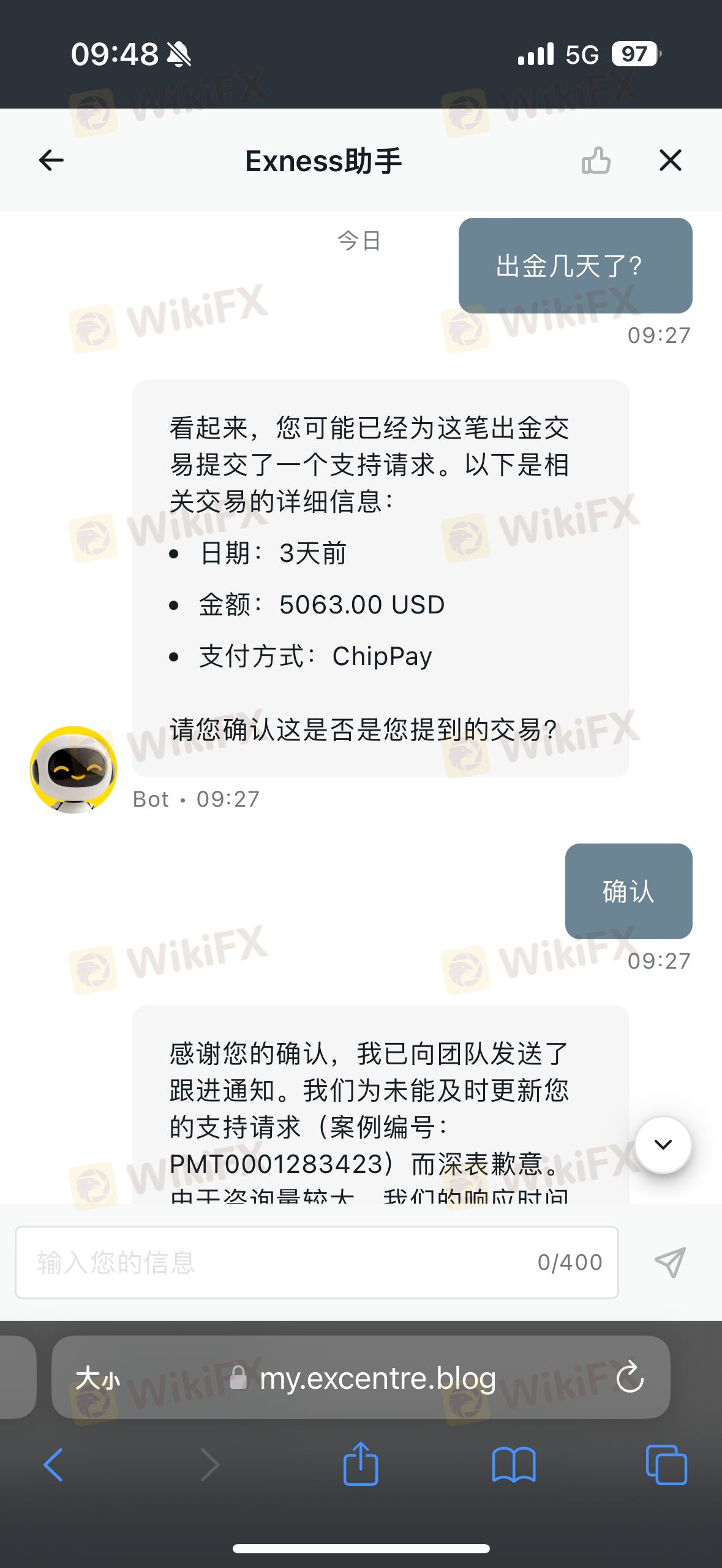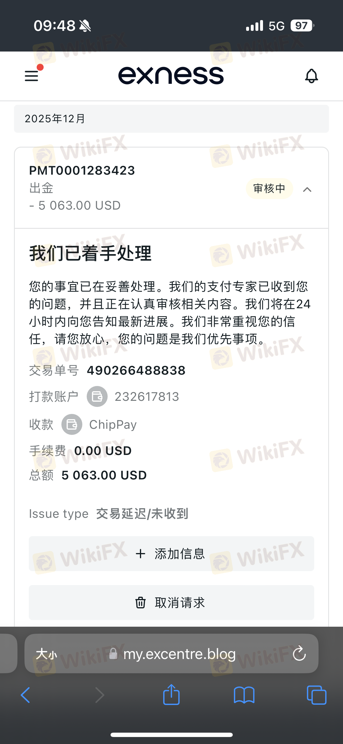 في 19 ديسمبر، تم سحب 5063 دولارًا. في الساعة 23:24 مساءً، أظهرت منصة EX أن هذه المعاملة قد اكتملت. لكن لم يتم إيداع المبلغ في بطاقتي المستخدمة للسحب. قدمت شكوى مرتين خلال هذه الفترة، وتواصلت مرارًا مع خدمة العملاء، لكن للأسف كانت إجاباتهم مكررة ولم يقدموا توضيحًا واضحًا عن موعد وصول المبلغ.
