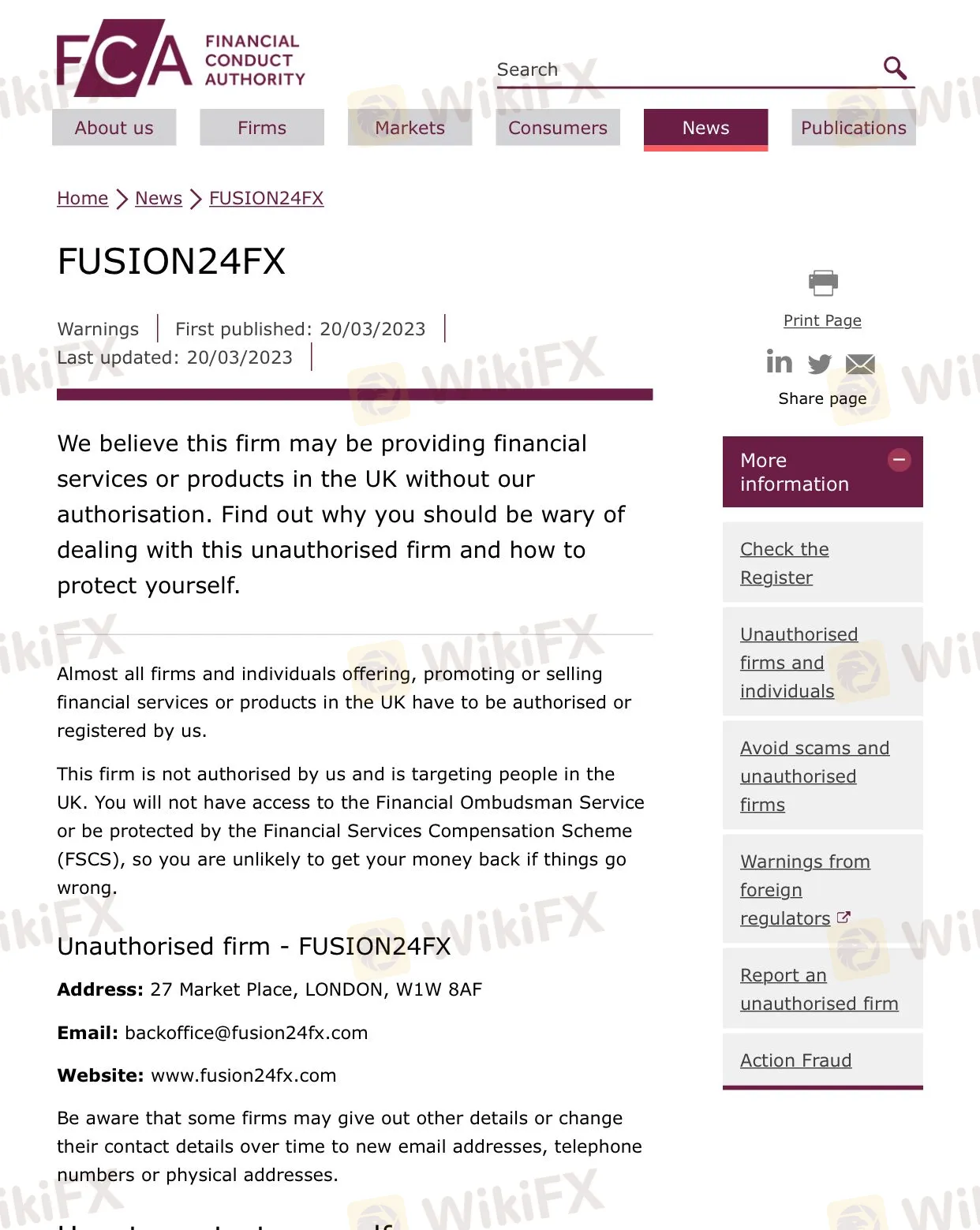وفقًا لـ FCA ، لا يحق للوسيط تقديم خدمات مالية. في الواقع ، صرحت هيئة السلوك المالي (FCA) أنه ليس وسيط مرخص ، وبالتالي لن تحصل على أي حماية. تثبت مثل هذه التحذيرات بشكل شبه مؤكد أن شركة ما تقوم بنوع من عمليات الاحتيال - لذا امتنع عن اختيار الشركات المشبوهة التي حظيت بتقييم سلبي من السلطات المالية ذات السمعة الطيبة مثل FCA. الطريقة الوحيدة للتأكد من أن استثمارك في أيد أمينة وأنك ستعامل بإنصاف ووفقًا لجميع القوانين هي اللجوء إلى وسيط شرعي ومرخص.