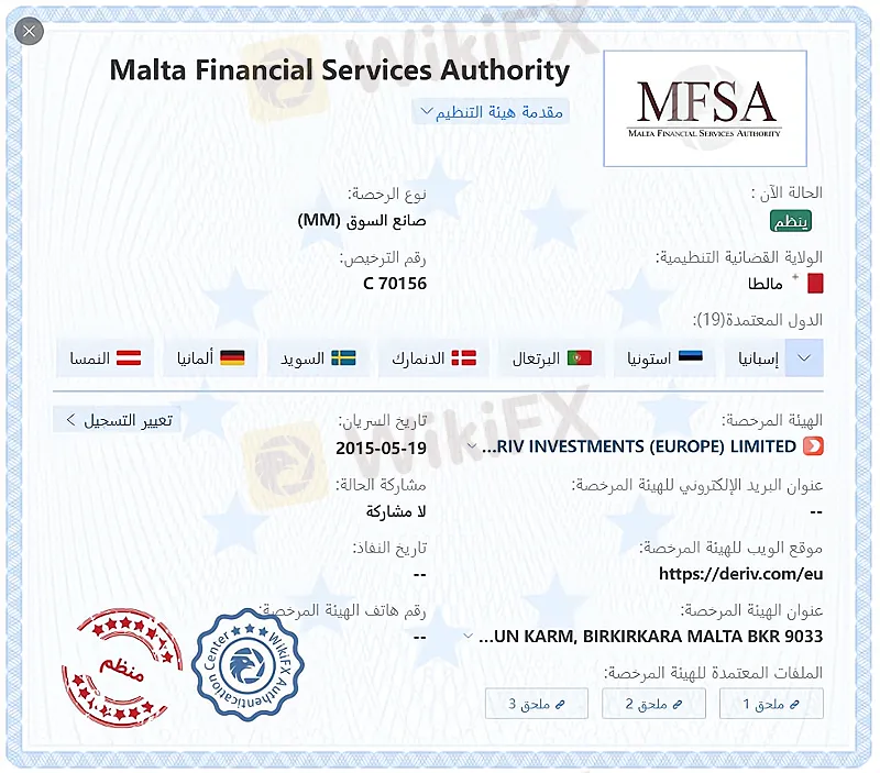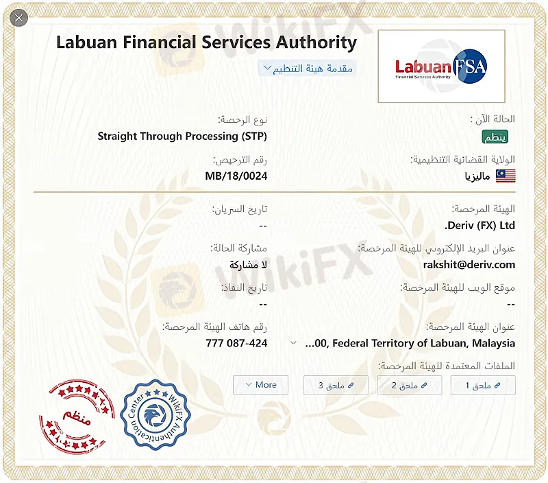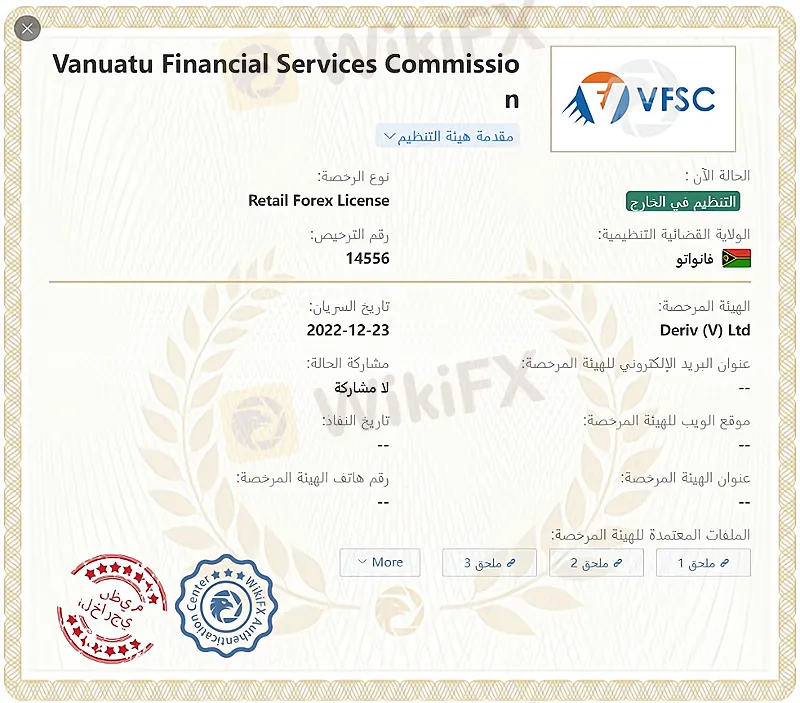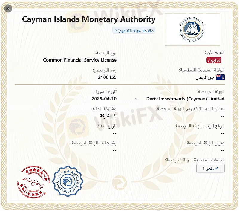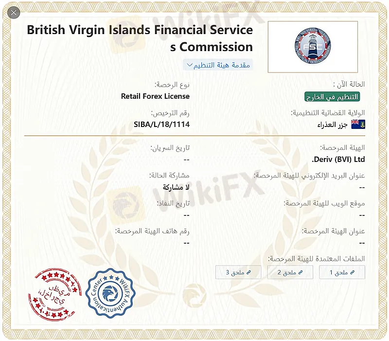 - ضمن صفحة “Regulatory Information” على موقع Deriv، تُشير إلى عدة كيانات لها تراخيص في موريتيوس، جزر كايمان، جزر فيرجين البريطانية، فانواتو.