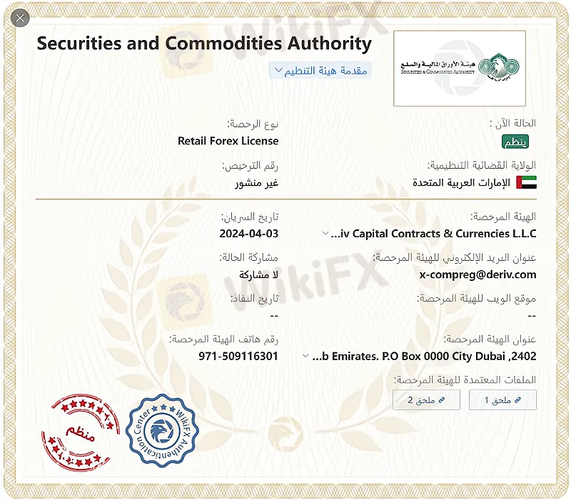 - في أكتوبر 2025، أعلنت Deriv أنها حصلت على ترخيص من SCA الإماراتي، عبر الكيان Deriv Capital Contracts & Currencies L.L.C. مما يمثل خطوة مهمة نحو التداول المنظم في منطقة الشرق الأوسط.