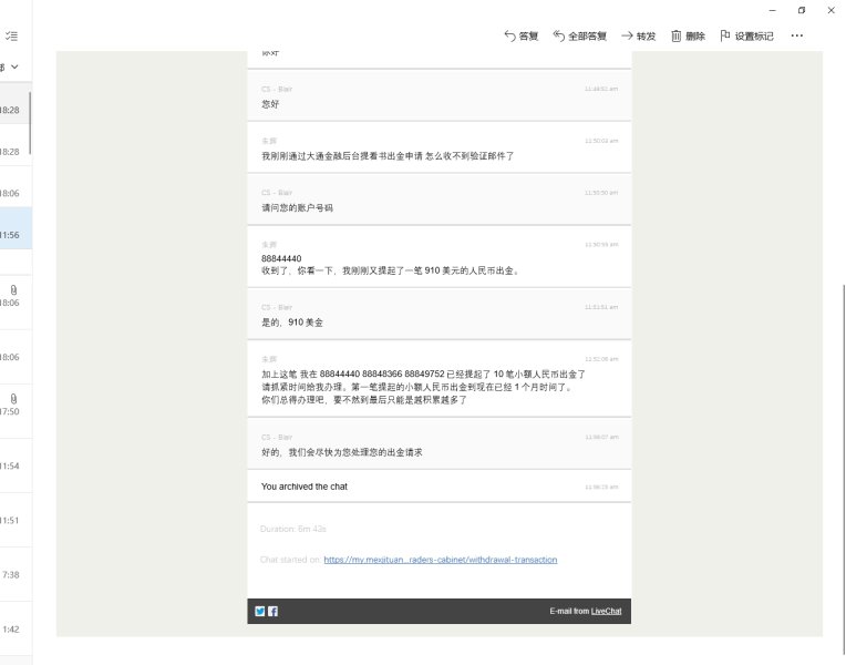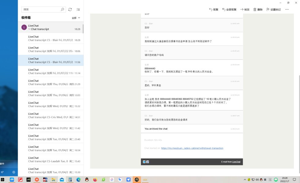 我的交易平台是:大通金融平台,我的交易账户是88844440 88848366 88849752三个账户,截止2022年1月7日,我三个账户还有资金明细如果:88848366账户净值:26193.90美元,;88844440账户净值:11040.76美元;88849752账户净值 :7792.33美元。三个账户总共净值合计:45026.99美元。从2021年11月开始申请出金就一直不成功。11月1日从88848366账户申请出金7500美元。结果拖了半个月不打款 最后又退回账户。然后平台通知说只能美元国际汇款。但是我所在的城市的银行不接收美元国际汇款落账。然后大通金融平台告诉我可以提起小额人民币出金。从2021年12月6日,我分别从三个账户里提起了10笔小额出金。结果硬是不给办理扣款打款。我期间也提起过大额的人民币出金。结果直接被大通后台拒绝了。这两个月来,我每天都在跟客服沟通,能否给我出金。结果天天说在办理,在办理,但是就是一直没有办理。我也给大通金融平台的邮箱发了很多次邮件,要求解决出金问题。但是一都没有给回复。我三个账户前前后后一共在大通入了将近一百万资金,大通出了问题后,为了把剩余的资金取回来,砍单无数。亏损很大。但是这些都不提了,最主要的大通直接不给我出最后的资金。这太黑心了。我把我入金时涉及的银行账户还有入金的记录也发到平台上。希望能引起大家的注意。