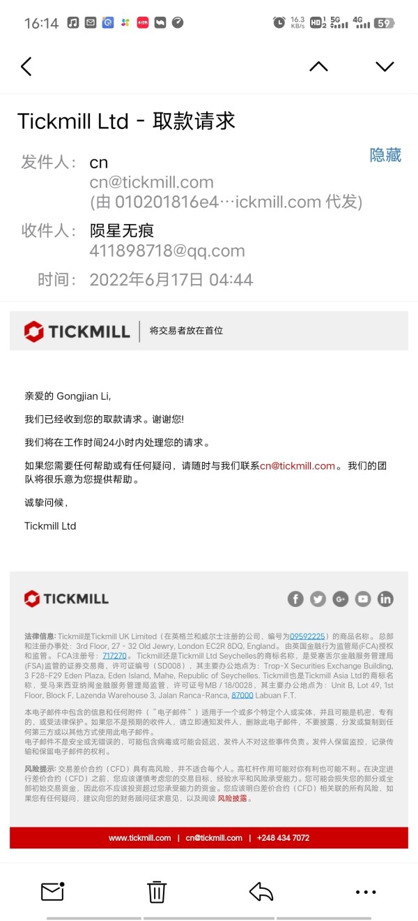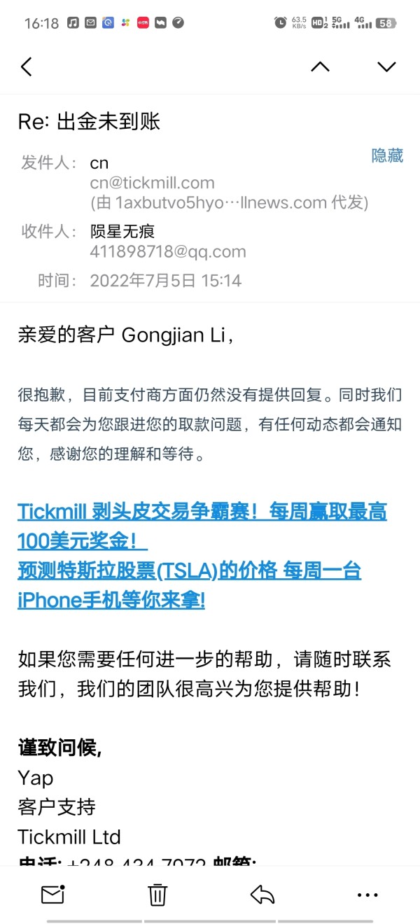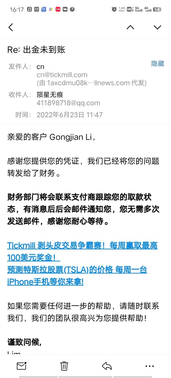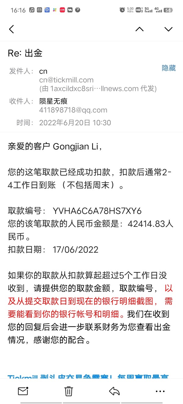 本人于6月16日申请出金,于6月17日扣款后至今,出金款一直没有到账。期间一直在申诉,客服一直推脱为支付商没有回复。请求给予关注