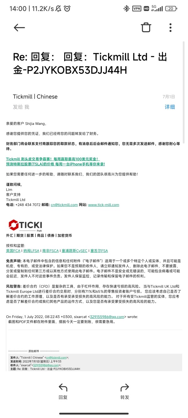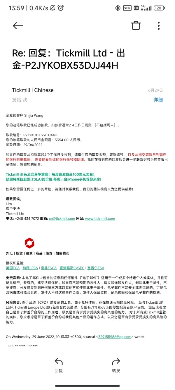 4个工作日过去了还没有到账,并且发邮件已经不回复了。