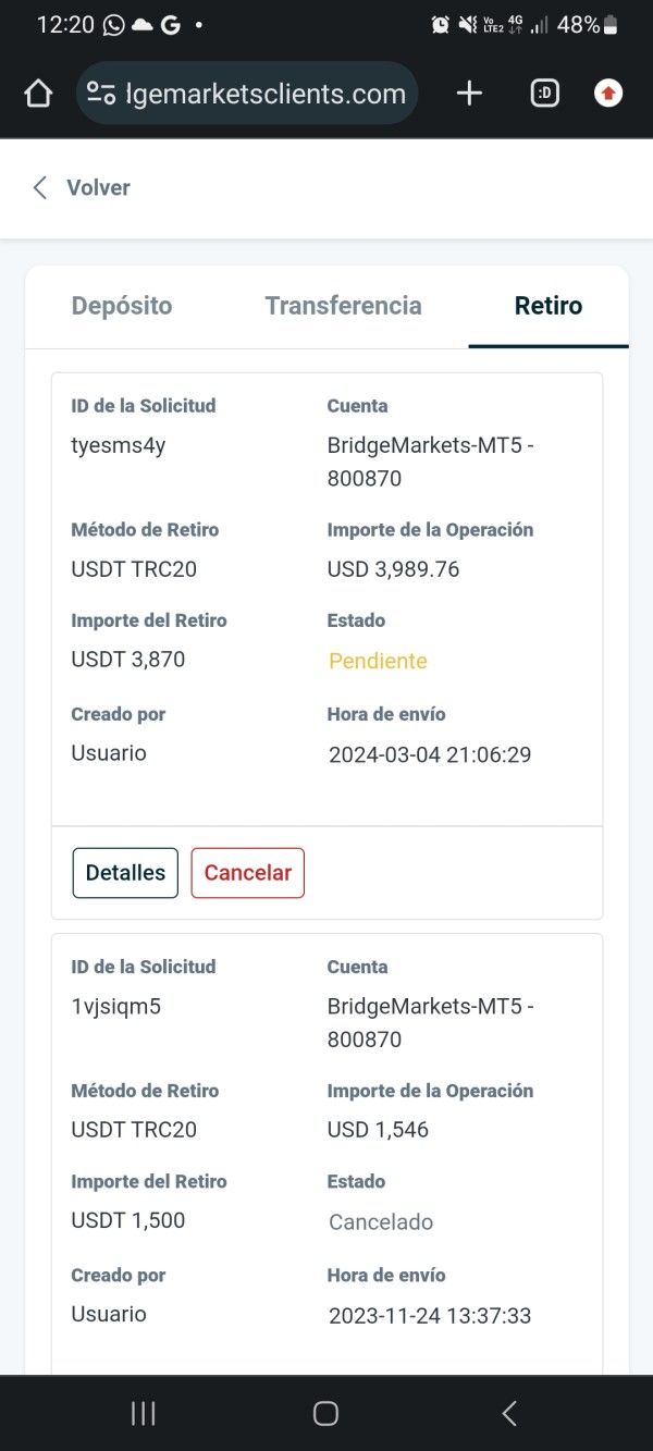 retiene capitales no deja retirar o cancela los retitos , y aparte cobran porcentaje de retiros, retiros que hasta el son de hoy no llegan a mi billetera ya mas de 1 mes , es un broker que no sirve para nada es una estafa no trabajar con este broker por ningún motivo, soporte ni el gerente de la latam dan solución de los retiros de mi cuenta ni la de unos amigos los corros es una odisea para que respondan