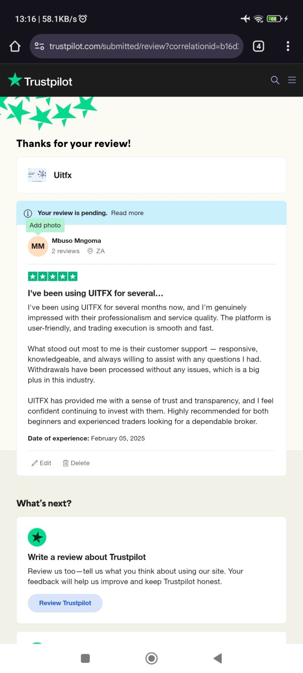 I've been using UITFX for several months now, and I'm genuinely impressed with their professionalism and service quality. The platform is user-friendly, and trading execution is smooth and fast. What stood out most to me is their customer support — responsive, knowledgeable, and always willing to assist with any questions I had. Withdrawals have been processed without any issues, which is a big plus in this industry. UITFX has provided me with a sense of trust and transparency, and I feel confident continuing to invest with them. Highly recommended for both beginners and experienced traders looking for a dependable broker.