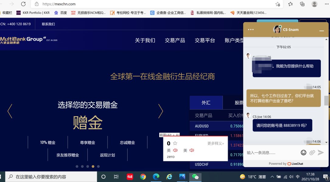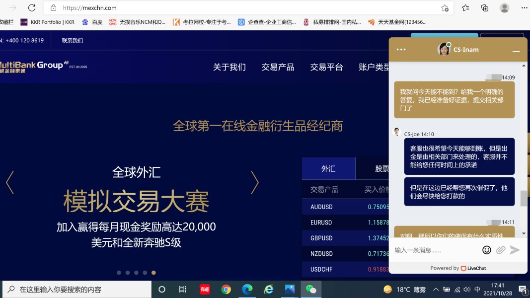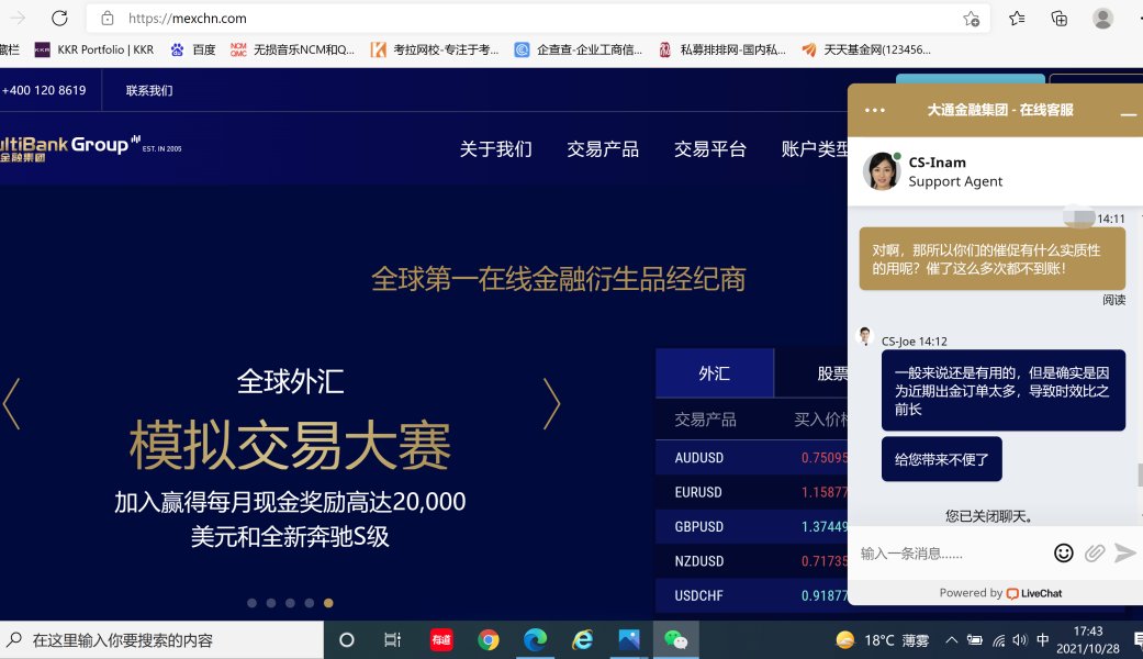 客户于2021年10月18日出金832美金,今天10.28号,十天过去了,还未到账,且在等待过程中已催促客服三次,还是收不到本金,一直拿出金人数太多,造成延迟来搪塞!!! 各位投资者一定擦亮眼睛,大通金融就是个黑平台!!! 客户资金如果到账,我一定会如实写到平台上来!!!