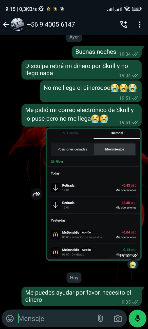 retiré mi dinero ayer y hasta ahora no me llega nada a mi cuenta de Skrill, intento comunicarme pero solo me mandan a mensajes que ya están programados y me dicen que del banco que va a tardar, pero yo retiré mi cuenta de Skrill y me intento comunicar con mi asesora no me responde mis preguntas