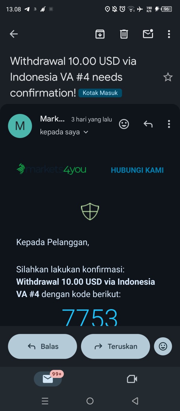 Pengalaman saya trading di Markets4you sangat positif. Saya suka platformnya yang mudah digunakan, eksekusi ordernya juga cepat, dan sejauh ini tidak pernah ada masalah saat melakukan penarikan dana. Tim dukungan pelanggan mereka juga responsif dan membantu. Sangat direkomendasikan! keamanan dan regulasi: Saya memilih Markets4you karena kredibilitas dan regulasinya yang kuat. Keamanan dana adalah prioritas utama bagi saya, dan broker ini memberikan rasa aman. Selain itu, mereka menawarkan berbagai instrumen trading yang lengkap. Broker terpercaya untuk jangka panjang." layanan dan fitur: layanan yang luar biasa. Saya sangat terbantu dengan materi edukasi dan analisis pasar yang mereka sediakan. Spread-nya kompetitif, dan tidak ada biaya tersembunyi. Proses deposit dan withdraw juga cepat, sangat efisien. Puas sekali dengan layanannya.