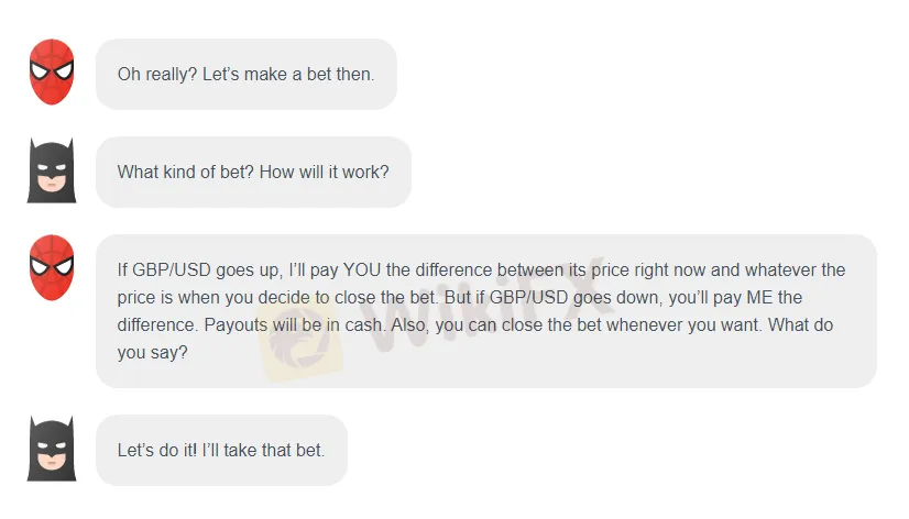 If GBP/USD goes up, I‘ll pay YOU the difference between its price right now and whatever the price is when you decide to close the bet. But if GBP/USD goes down, you’ll pay ME the difference. Payouts will be in cash. Also, you can close the bet whenever you want. What do you say?