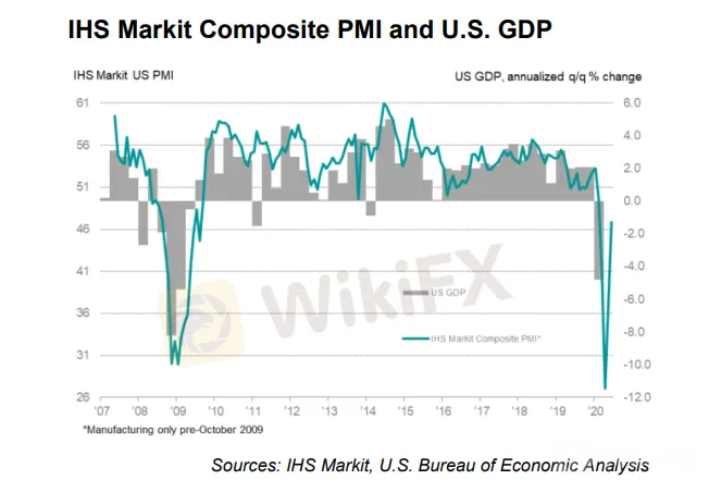 According to WikiFX App, the Markit Services PMI increased to 46.7 on June 2020 from 37.5 in the previous month; the Markit Manufacturing PMI rose to 49.6 on June 2020 from 39.8 in May. The two indicators have recorded a new high over the past four months, but below the entrepreneur confidence threshold, which indicates the US economy is still in a weak status.
