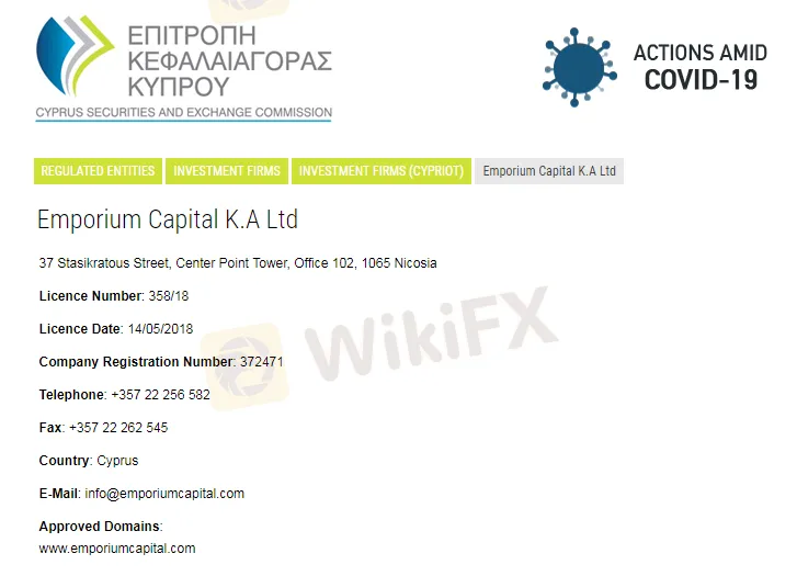 This field investigation confirms Emporium Capitals office address in Cyprus. On the WikiFX APP, the broker receives an overall score of 4.20, and its CySEC authorized representative license is under normal supervision. Nevertheless, it accepts non-MT4/5 software. Please pay attention to the potential risks.