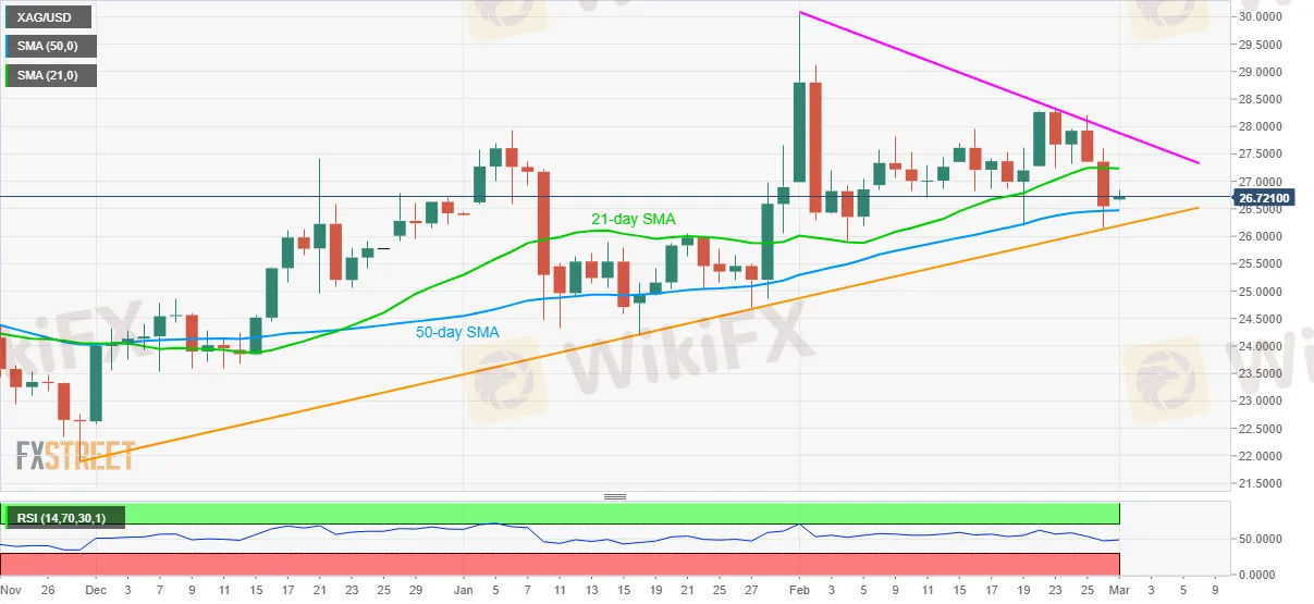 Alternatively, a downside break of 21-day SMA, currently around $26.50, will fetch the bullion back to the stated support line near $26.20.