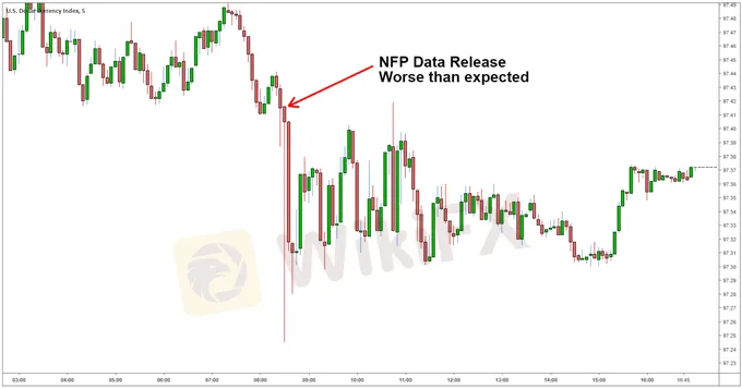 The chart below shows how volatile forex can be after an NFP release. The expected NFP results for March 8, 2019 were 180k (job additions), the actual result disappointed with only 20k jobs being added. As a result, the Dollar Index (DXY) depreciated in value and volatility increased.