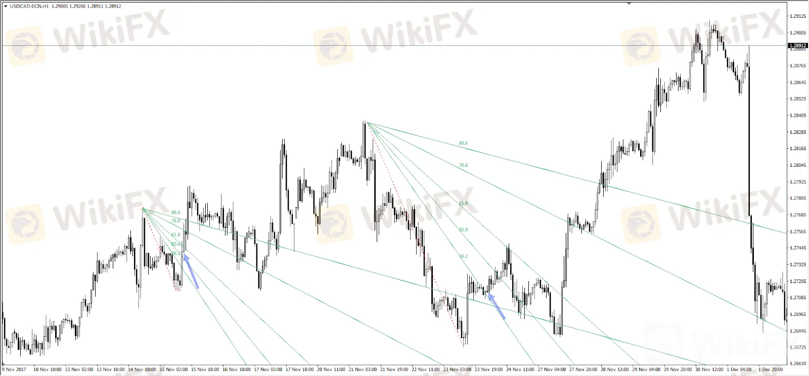 Very often, the main supporting level on the Fibonacci Fan is the 61.8%. By applying the following rule, we might have a good chance for an entry purely based on Fibonacci Fan trading. Fibonacci Fan is the default indicator on MetaTrader 4 (MT4) and MetaTrader 5 (MT5), and you can assess it directly. Once the price breaks the 38.2% level, it will usually go to the 61.8% level. We can make an entry at 38.2, aiming for 61.8. This rule works best in a trending environment, but it can also be used in a countertrend.