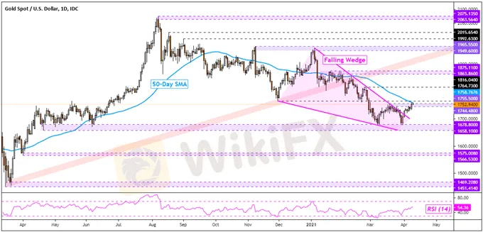 Gold prices have confirmed a push above a bullish Falling Wedge chart pattern. However, prices are stuck around the key 1744 – 1755 resistance zone as well as the 50-day Simple Moving Average. As such, we could see XAU/USD turn lower here back towards the March low. Pushing above immediate resistance on the other hand may open the door to extending last months bounce.
