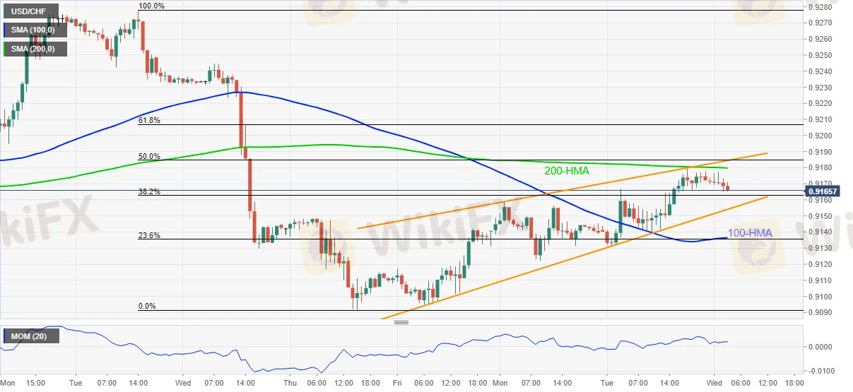 USD/CHF pauses weekly rebound, easing to 0.9167 ahead of Wednesdays European session. In doing so, the Swiss currency (CHF) pair steps back from the 200-HMA inside a short-term rising wedge bearish chart pattern.