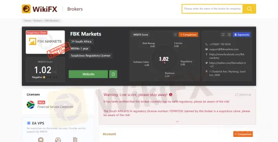 FBK Markets, also called FBK Markets SA (Pty) Ltd, is a broker who was found in 2020. The traders who invest in FBK Markets are provided with a leverage up to 1:1000. It is located at 1 Chadwick Ave, Wynberg, Sandton, 2090. According to its website, it vaguely claims that “ it is a South African owned financial broker”, which lacks information about who exactly owns and runs the company. The website looks very simple and uninformative. Besides, FBK Markets claims that they are regulated by the FSCA South Africa (license number: FSP49769). However, according to WikiFX, the regulatory status is a suspicious clone, which means they dont have a legitimate license and you are likely to lose the control of your money if you invest in it. WikiFX currently gives FBK Markets a very low rating of 1.02/10. Therefore, we advise you to keep your money away from this broker.