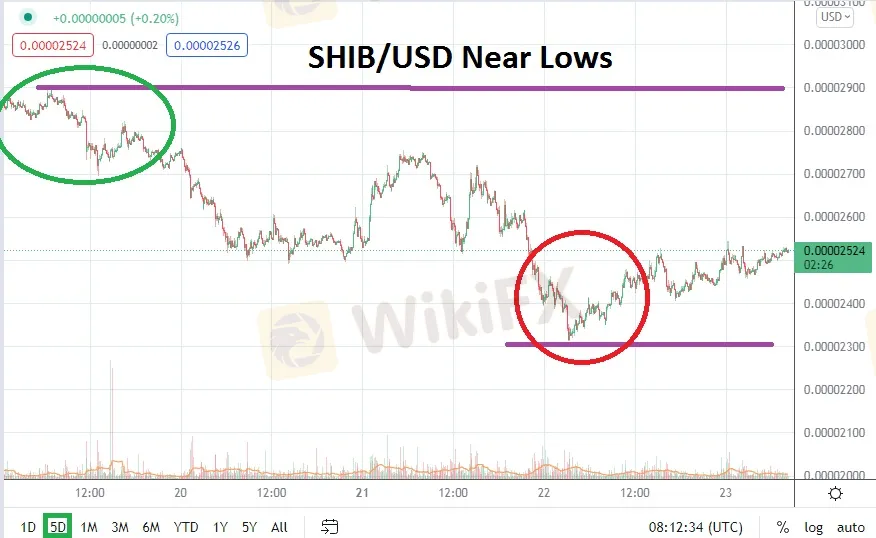 Current value for SHIB/USD does put it within the middle of its short-term price range based on a five-day outlook. The broad cryptocurrency market has staged a bit of a reversal higher the past day, but values remain dangerously close to support levels which if proven vulnerable could create more selling if nervous sentiment escalates. SHIB/USD remains a prime volatile cryptocurrency and one that must be treated carefully by speculators who want to wager on its price.