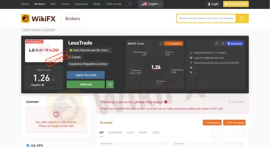 LexaTrade is an offshore broker registered in Saint Vincent and the Grenadines. LexaTrade says to be owned by a company called Swissone Group limited. This is a company with registered address in Saint Vincent and the Grenadines. Saint Vincent and the Grenadines is an offshore zone where forex brokers are not regulated in any way. According to WikiFX, LexaTrade doesnt have a legitimate license. It may take your money away fraudulently. Therefore, WikiFX gives LexaTrade a very low rating of 1.26/10. We advise you to stay away from this broker.