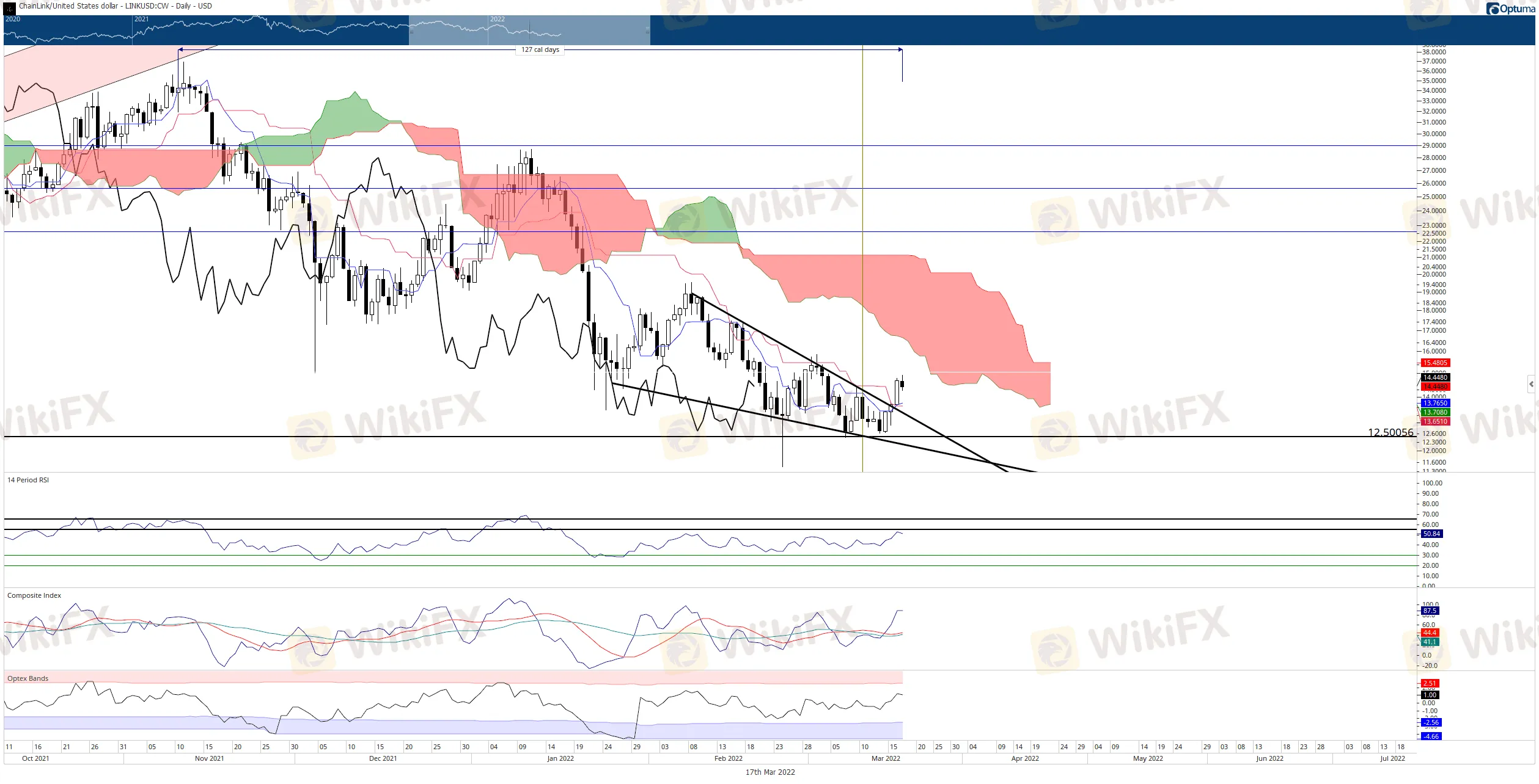 The hypothetical long opportunity for Chainlink price is a buy stop at $16, a stop loss at $12, and a profit target at $32. However, while the profit target at $32 is derived from Point and Figure analysis, LINK is more likely to halt at the $25 value area. $25 is a naturally powerful psychological number, but it also contains the 50% Fibonacci retracement and the Kijun-Sen.