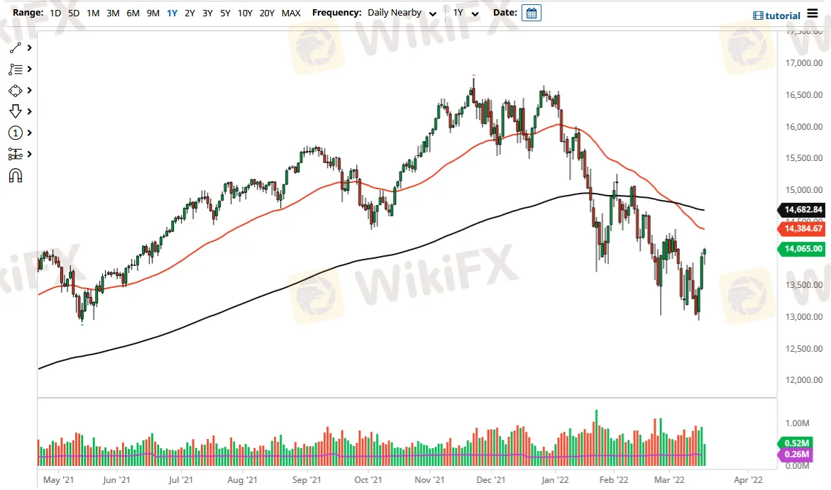 Abstract:The NASDAQ 100 initially pulled back during the trading session on Thursday but then turned around to rally and a break above the 14,000 level. The candlestick does look rather bullish, but if we were to break down below the bottom of the candlestick, it would turn this candlestick into a “hanging man.” That is a very bearish sign, so it will be interesting to see how this plays out.