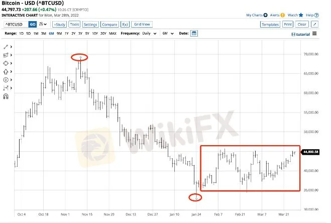 The chart shows that the 52% correction led to a consolidation period where Bitcoin traded between $34,366.52 and $45,734.08, with the price moving past the high end of the range on Mar. 27.