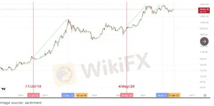 As shown in the image above, after the halving in 2016, the price rose from 11 July to a peak in December 2017. after that, it dropped as a result of the mid-halving in July 2018. the halving in May 2020 raised the price again to peak in October 2021 and the next event is the mid-halving on 11 April.