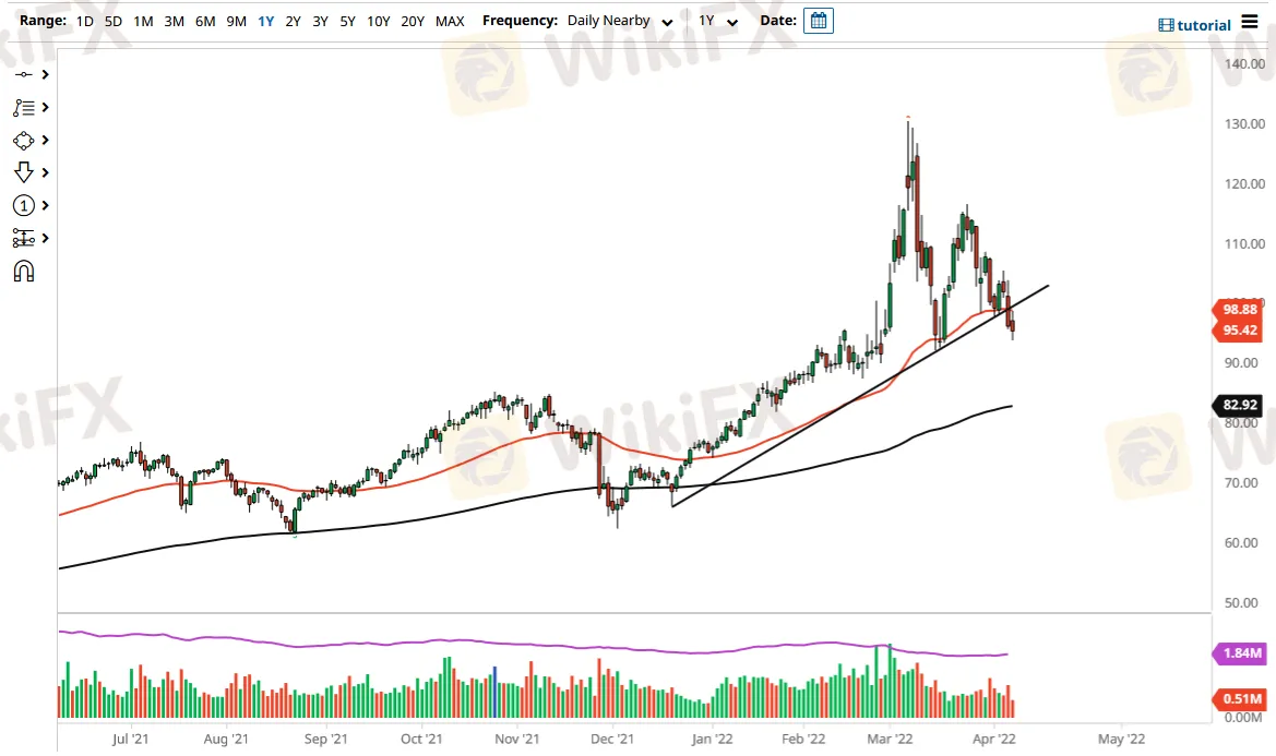 Abstract:The West Texas Intermediate Crude Oil market initially rally during the trading session on Thursday to retest the 50 Day EMA and of course the previous uptrend line. Because of this, it looks as if the downtrend is intact, and I do think that it is probably only a matter of time before crude oil breaks rather significantly, perhaps reaching the $95 level early during the session on Friday, and maybe even breaking down below there.