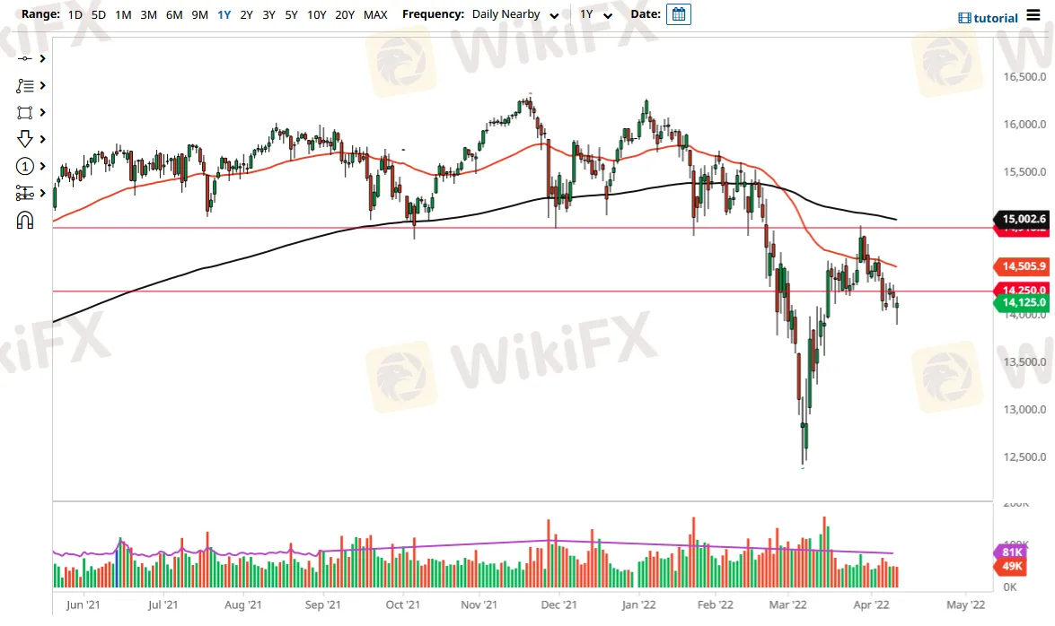 With that being said, if the market does rally from here, I think it is short-term relief more than anything else. If we were to take out the 50-day EMA, then we could go as high as €15,000, but that obviously would take a lot of bullish pressure. It is difficult to imagine a scenario where stocks do well in this environment because there is so much in the way of negativity out there when it comes to not only market sentiment, but inflation. The European Central Bank has no interest in trying to tighten monetary policy, so that might be the one thing that is bullish here.