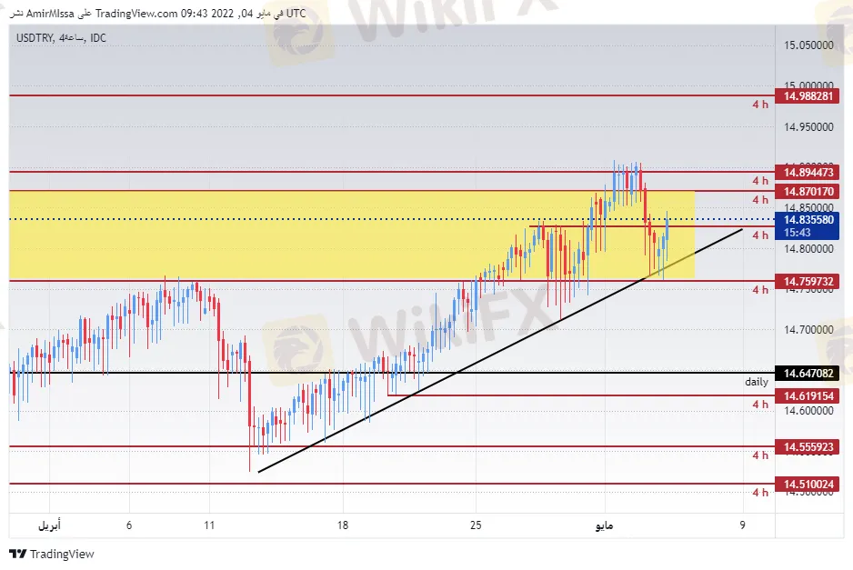 On the technical front, the Turkish lira rose slightly against the dollar during today's trading, as the lira is still trading within the demand areas shown on the chart. The pair also rose above the moving averages 50, 100 and 200, respectively, on the four-hour time frame as well as on the 60-minute time frame. At the same time, the pair is based on the ascending trend line shown on the chart. With continued trading within a limited trading range. The pair is trading the highest support levels, which are concentrated at 14.82 and 14.74 levels, respectively. On the other hand, the lira is trading below the resistance levels at 14.90 and 14.99. We expect the lira to continue to decline, especially if the pair closed above the resistance levels of 14.91. Please adhere to the numbers in the recommendation with the need to maintain capital management.