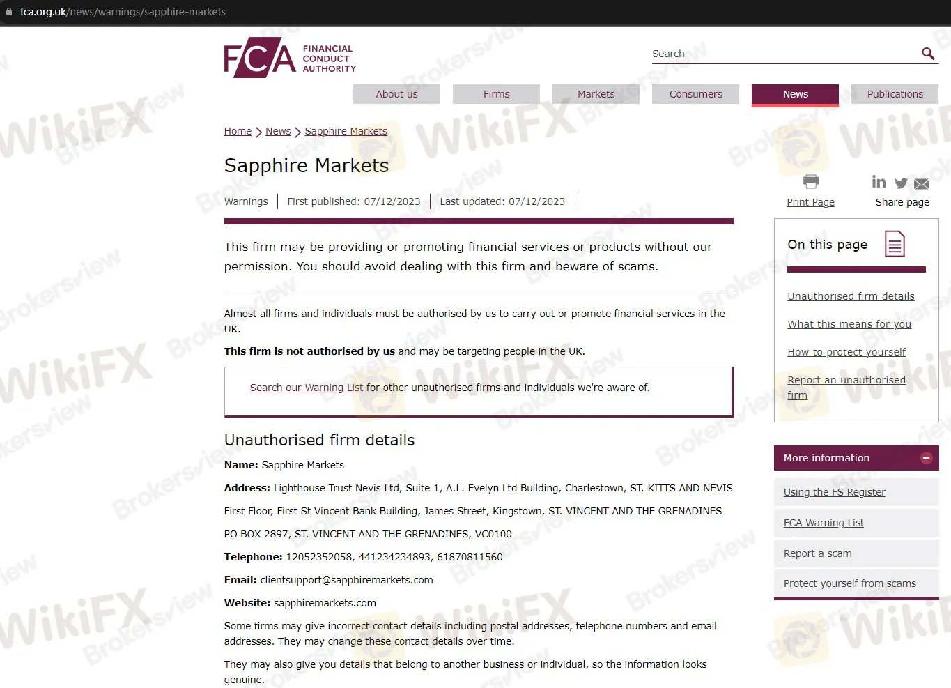 On December 7, the UK's Financial Conduct Authority (FCA) regulator warned against an unauthorized broker called Sapphire Markets, reminding the public to be aware of financial safety.