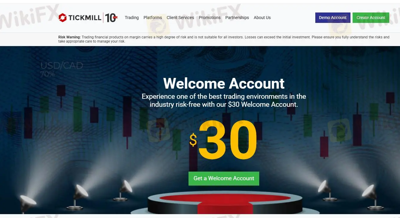 Tickmill offers a $30 no-deposit bonus. Available for new traders only, Tickmill offers a $30 Welcome Account. It allows new investors to learn more about Tickmill's services and try them firsthand without risking their funds. The profits earned making these trades are yours to keep.