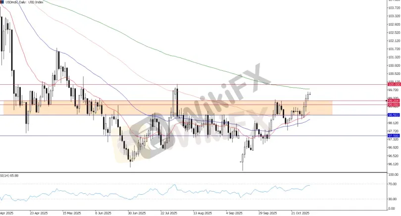Currently trading near 99.50, the index maintains positive momentum, extending its rally that began in October. From a technical standpoint, the next upside target lies in the 100.00–100.30 region — a crucial resistance band that could define whether the rally extends further or pauses for consolidation.