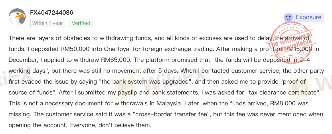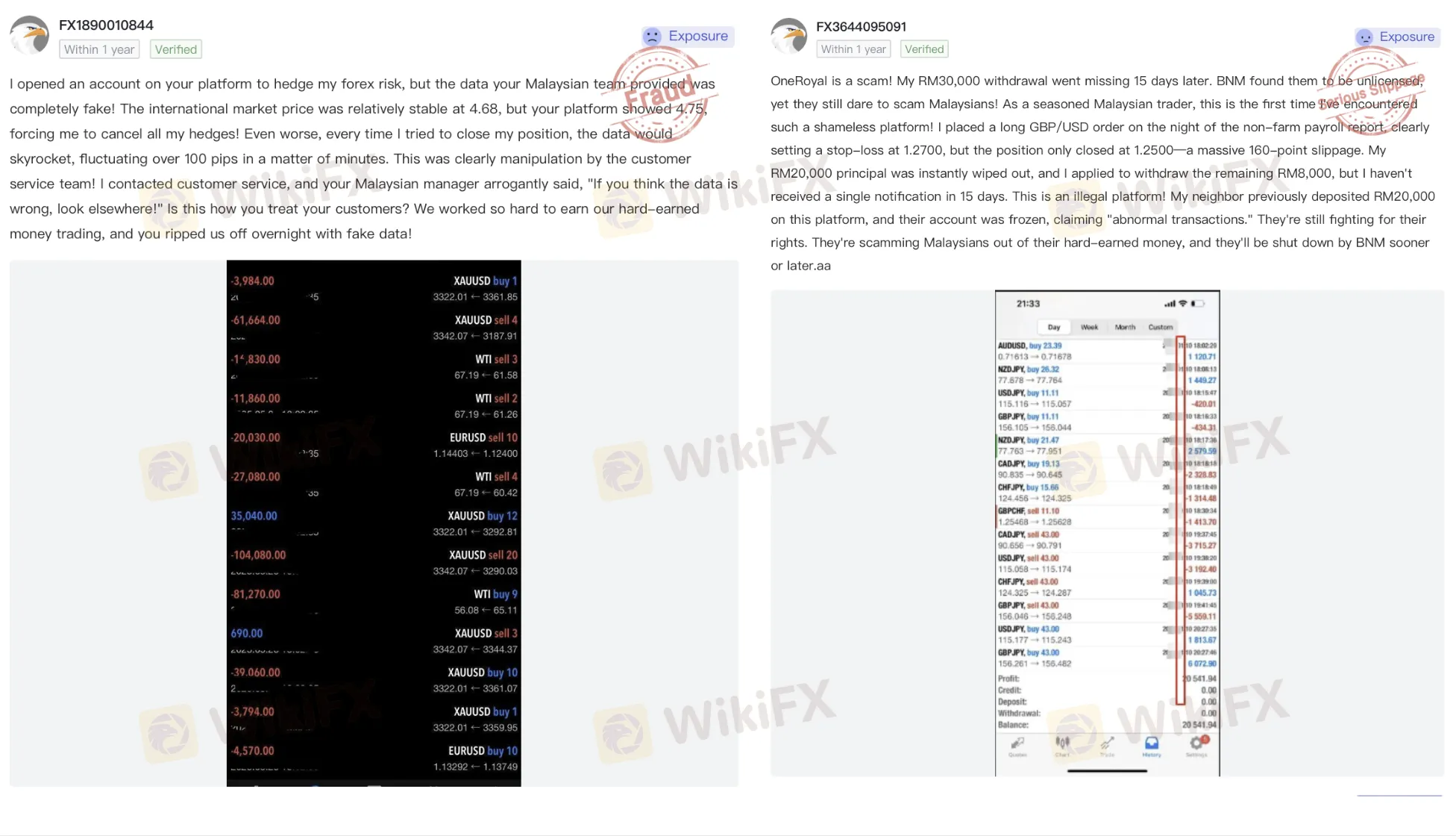 The Allegation: One detailed report describes a suspicious event where a trader placed a stop-loss on a GBP/USD position. The user alleges the platform ignored the stop-loss, allowing the price to slip 160 points beyond the limit, resulting in a massive loss of RM30,000. Another user noticed discrepancies between OneRoyal's price data and international market prices, forcing them to close hedges at a disadvantage.