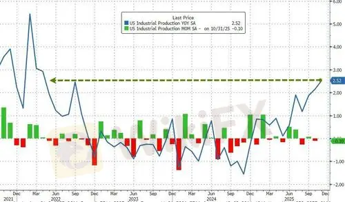 Following the much-stronger-than-expected GDP print, US Industrial Production also surprised to the upside, rising 0.2% MoM in November and pulling the YoY change up to 2.52% - the strongest annual growth since April 2022...