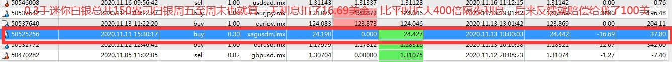这家平台趁你长线持有订单偷偷吃掉你的利息,它正常吃也正常,可是突然某一天利息扩大400倍,2017年2月发生一次,有一个月的时间每笔订单隔夜都比平时扩大10几倍,总共比平时多扣了4100美金,找他们客服和邮箱投诉,心虚一直不回复不解决,后来2020年12月份又发生一次,利息更离谱直接扩大400倍,投诉上去两封邮件还是不回复,过来半个月反复投诉然后就给我赔偿了100美金,给的解释是数据录入错误,天,这么大的平台每天都数据都要手动录入吗,难道利息和点差天天可以按他们的喜好想怎么操纵怎么操纵,后来我再去追究2017年利息多扣的问题,他们就说2017年利息多扣是没有问题的,2020利息多扣是有问题的,其实都是利息多扣几十倍同样一个性质的问题,站在他们的角度即使错了赔偿100美金是可以接受的,赔偿4100美金是不可接受的,所以就不肯赔偿,这个号称最大最正规的平台,大家一定要擦亮眼镜,小心你的钱一点点吃掉,我五年交易总共扣了我46600美金的隔夜利息,有多少是多扣的呢,今天曝光,没有做这个平台千万小心介入,做过的自己去查查自己的订单有没有像我一样多扣了利息没有被发现,以下是截图以此为证。