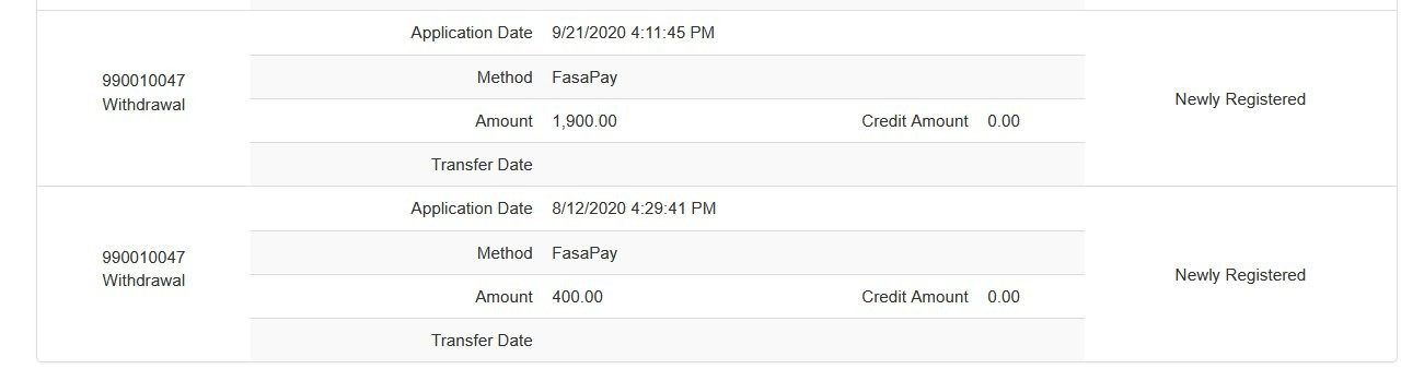 The status is still "newly registered" after all the time. On the second screenshot you can see my balance and few trades. The deposit and withdrawal of 1800 USD means I asked them to cancel wire transfer withdrawal and submitted another Fasapay one.