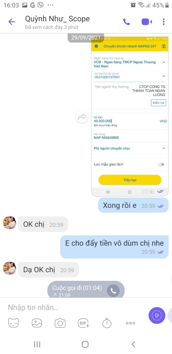 Các nhân viên của sàn scope markets là Phí Hải Linh sđt 0866.232.038 và Quỳnh Như 0374169005; 0846663224 lôi kéo dẫn dụ tôi tham gia cổ phiếu. Trong đó Quỳnh Như do sàn giới thiệu là chuyên gia, đã dẫn dụ và đọc lệnh cho tôi đầu tư các cặp ngoại tê. Như luôn trấn an tôi không sao cứ theo hướng dẫn của Như, và chỉ trong một tuần từ ngày 24/09/2021 đến 01/10/2021 đã làm cháy mất của tôi 86 triệu đồng Sau khi thấy tôi không có khả năng nạo tiền họ liền đẩy tôi ra khỏi group zalo