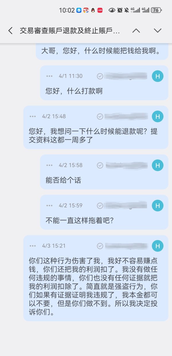 一、账户操作与出金事实 入金时间:2026 年 3 月 6 日 入金金额:6,000 USD 交易方式:本人纯手工操作 累计盈利:5,828 USD 二、沟通情况 在此期间,我多次尝试通过以下渠道进行沟通: 都是以违规交易不给出金,我纯纯手工交易,盈利了就不给出金,一直拖着不给处理。过了一个月最后就说只退本金。这不是妥妥的黑平台吗?我想让平台看看我到底违规没有。这不就是平台玩不起吗?赚了钱就不给,亏了钱怎么不说补偿我?