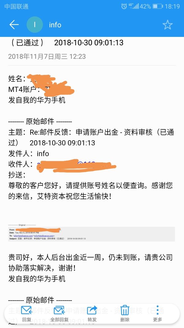 出金未到账,要求提供账户和姓名,没有处理结果,在发邮件也不会复