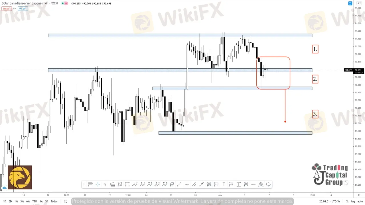 1. Luego de un rally alcista que llevo al precio a tocar el rango de los 91.150; se evidenció la posibilidad de una estructura de triple techo sobre el mismo rango, lo que por inercia del mercado, llevó al precio a crear una estructura bajista, que podría consolidar entradas de venta hacia la zona (2), siempre y cuando se cree una estructura de velas adecuadas para tal fin.