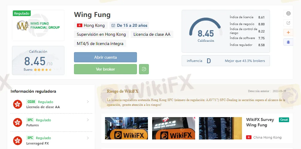 Wing Fung cuenta con una calificación de 8.45 otorgada por el equipo de Wikifx, a través de los índices de licencia, de negocio, control de riesgo, software y regulador. Lo que implica que este bróker se encuentra aprobado, siempre es bueno poder leer acerca del mismo y de las opiniones de usuarios que han operado con este bróker.
