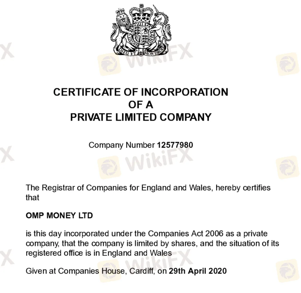 Ante las autoridades mercantiles del gobierno del Reino Unido, OMP Money esta registrado bajo el número de compañía 12577980 como una empresa privada limitada por acciones.
