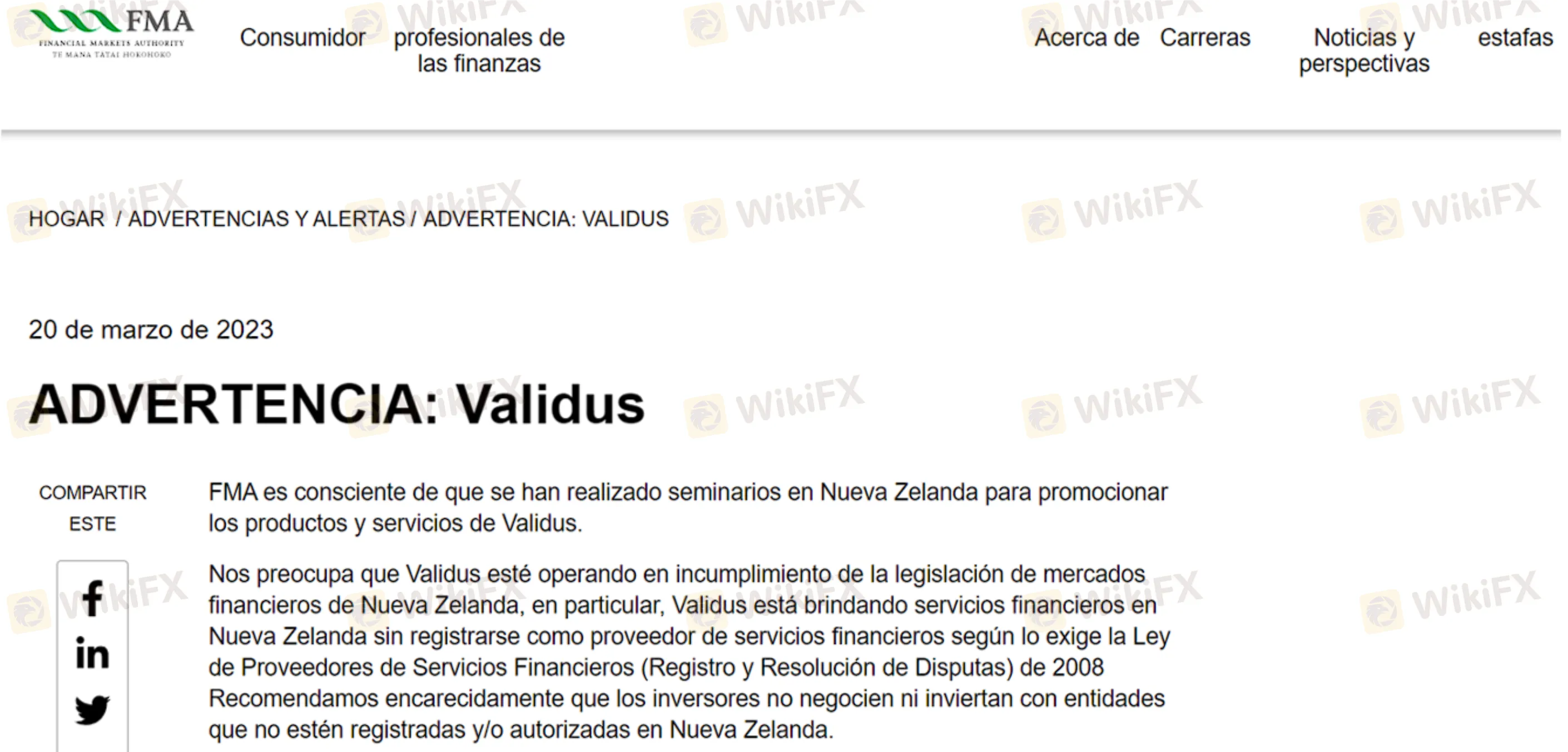 La advertencia sigue a una primera advertencia emitida por la Autoridad de Mercados Financieros (FMA) de Nueva Zelanda el 15 de septiembre del 2022, y a una orden de la misma entidad de que Validus cesara sus operaciones en todo el país en febrero 16 del presente año.