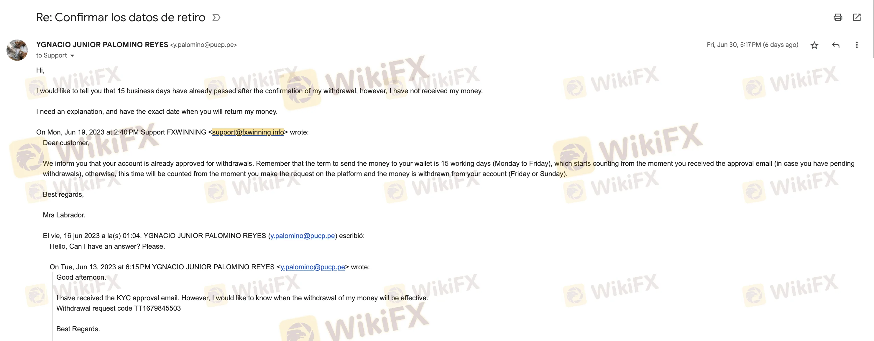 “Solicité el retiro de mi capital en el mes de marzo, sin embargo, ya estamos Julio, y el bróker es incapaz de pagar el capital invertido en su plataforma. Ellos solicitaron el llenado del formulario KYC, este fue aprobado hace más de 15 días hábiles (plazo que ellos aseguraron en que desembolsarían el dinero), sin embargo, hasta el día de hoy, no he recibido ningún pago, ni respuesta por parte de ellos. Información adicional: FxWinning actualmente afronta una demanda legal en EEUU por no devolver sumas millonarias de sus inversores.”