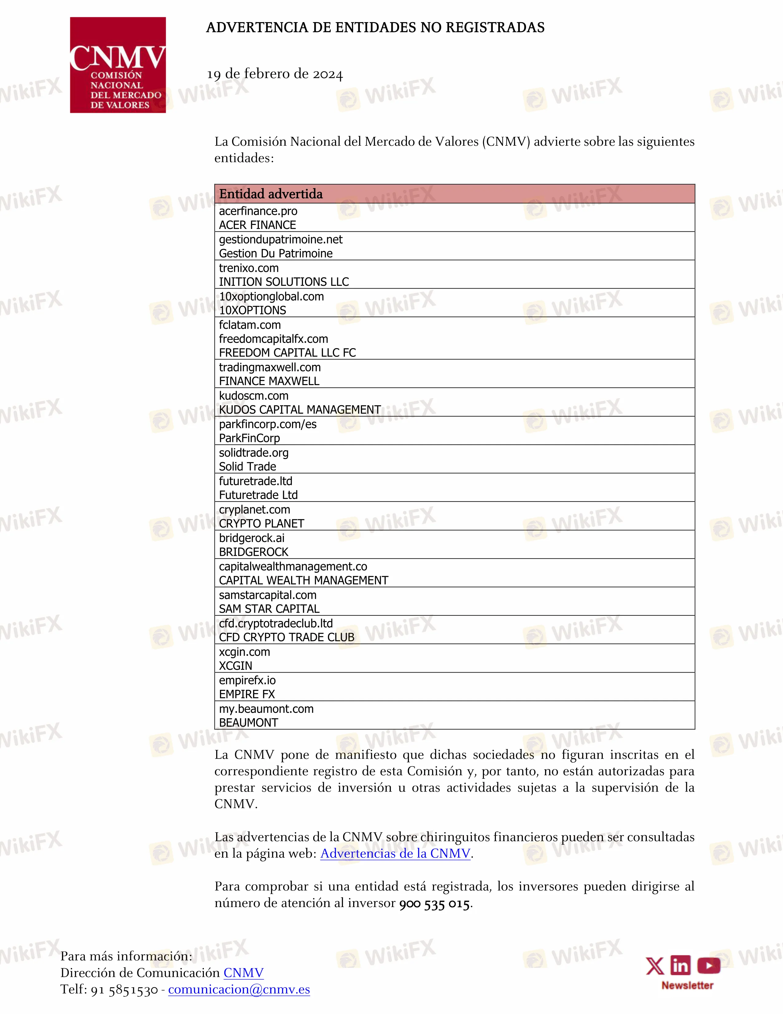 Las advertencias de la CNMV sobre entidades fraudulentas pueden ser consultadas en la página web: https://www.cnmv.es/Portal/advertenciaslistado.aspx?tipoAdv=1 . Para comprobar si una entidad está registrada, los inversores pueden dirigirse al número de atención al inversor 900 535 015. Además, la web de la CNMV ofrece un buscador de entidades advertidas.