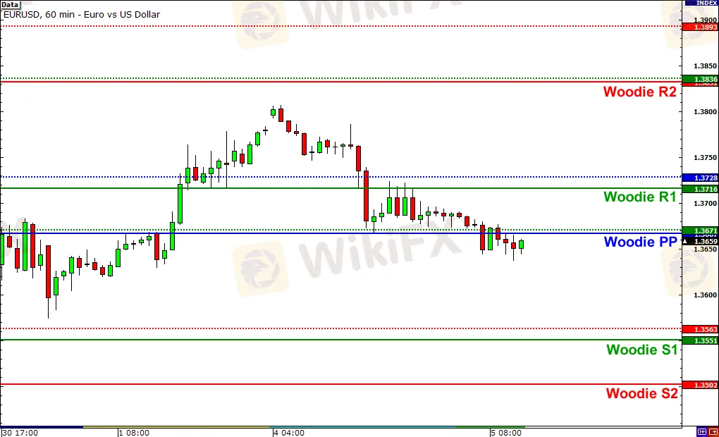 Narito ang isang halimbawa ng chart ng pagkalkula ng Woodie pivot point na inilapat sa EURUSD.