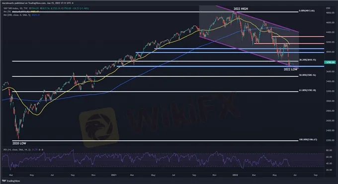 Pagkatapos agresibong ibenta sa unang bahagi ng buwang ito , nagawa ng S&P 500 na i-rebound nang katamtaman ang suporta sa channel, na umaabot mula 3,700 hanggang 3,735, ngunit hindi pa ito nagsasagawa ng makabuluhang pagbabalik. Upang magkaroon ng kumpiyansa na ang pinakamasama ay tapos na at na ito ay hindi isa pang dead-cat bounce, ang index ay dapat umakyat sa itaas ng paglaban sa 3,810 at bawiin ang sikolohikal na 4,000 na antas. Sa kabilang banda, kung kukunin muli ng mga nagbebenta ang kontrol sa merkado at itulak ang mga presyo sa ibaba 3,735/3,700, maaaring bumilis ang downside pressure, na ilantad ang 3,500 area, isang pangunahing palapag na nilikha ng 50% Fibonacci retracement ng 2020/2022 rally.
