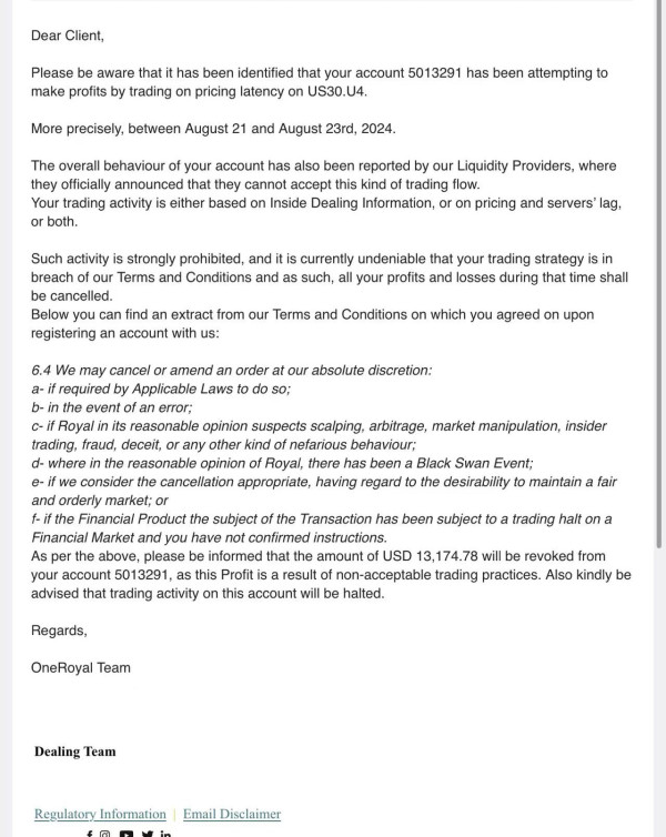 赚钱扣除,说我可能提前预知行情或者使用ea进行交易。现在平台扣除盈利的理由真的越来越奇葩。我不是先知也没有使用任何的套利策略。另外我开户的时候业务员也告诉我,没有任何交易限制。然后现在赚钱找理由扣除。大家千万不要考虑这个平台。后续只能找国外律师去他们牌照注册地或者展会维权了。交易账户5013291